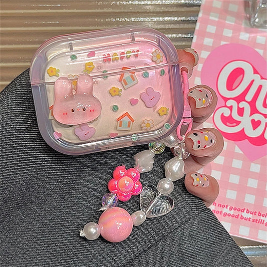 🐰💕 Adorable 3D Pink Bunny AirPods Case with Flower Pendant 🌸✨