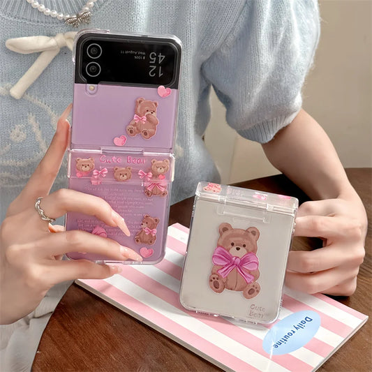🐻✨ Adorable Bear Hinge Phone Case for Samsung Galaxy Z Flip 6/5/4/3 - Clear Cover with Chain Strap! 🌈💖