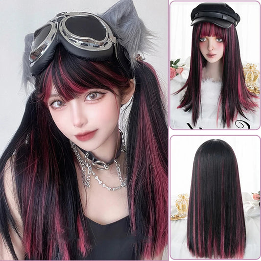 Kawaii Long Black & Red Wavy Wig πβ¨ - Cosplay & Daily Use with Bangs π | Harajuku Style!