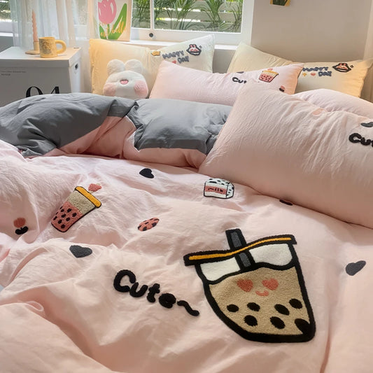 Kawaii Milk Tea Cartoon Duvet Set ββ¨ Plush Bedding for Girls ποΈπ