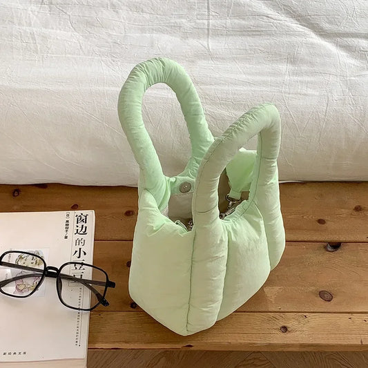 Kawaii Cozy Nylon Puff Tote πβ¨ | Mini Designer Handbag for Winter Fun βοΈπ | Stylish Shoulder & Crossbody Bag with Chains
