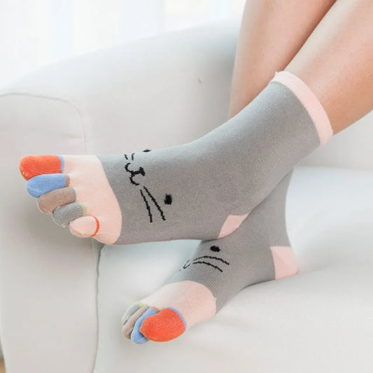 Kawaii Cat Cartoon Five Finger Socks 🐾🎨 | Soft & Colorful Women's Toe Socks for All Seasons 🌈✨