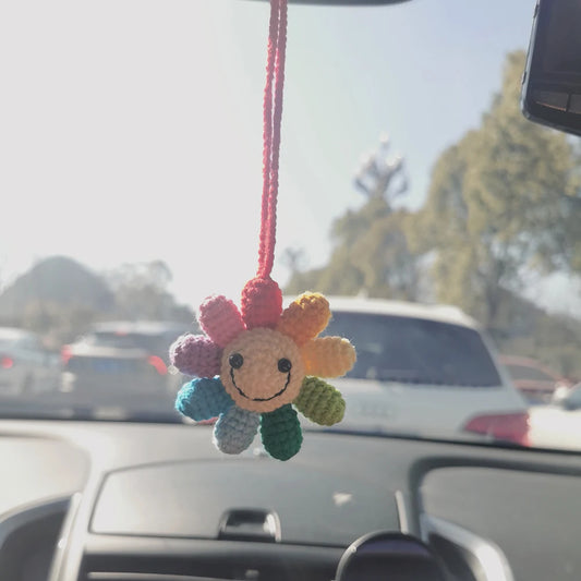 Kawaii Rainbow Flower Waffle Car Mirror Charm 🌸✨ | Handmade Crochet Decor for Joyful Vibes!