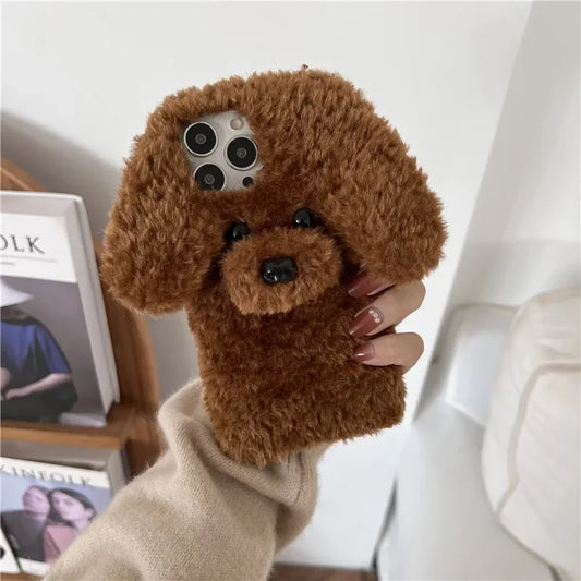 Kawaii 3D Fluffy Teddy Dog Phone Case for iPhone 16/15/14 - Adorable Plush Fur Cover 🐶✨