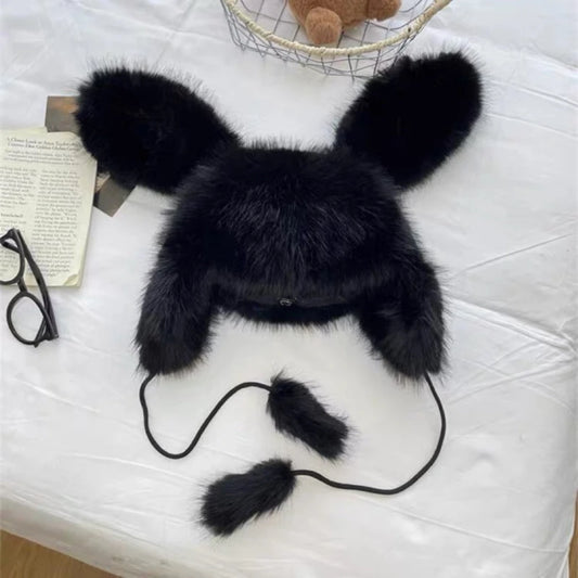 Cute Kawaii Black Bear Ears Plush Rabbit Fur Hat 🐻❄️ | Cozy Knitted Cap for Winter Fun!