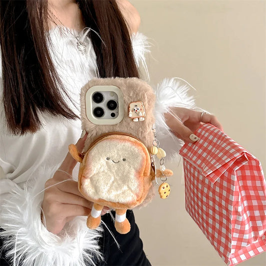 Kawaii Plush Bread Change Purse Phone Case for iPhone 16/15/14/13 Pro Max 🍞💖 Shockproof & Adorable Cartoon Design!