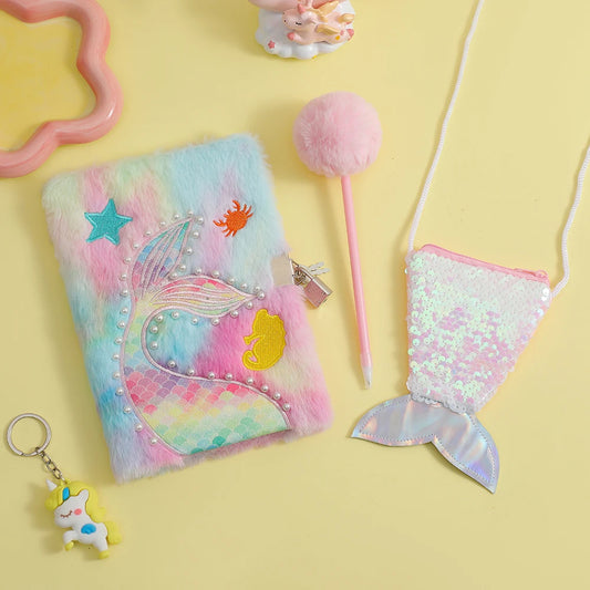 Kawaii Mermaid Plush Stationery Set π§ββοΈβ¨ - Fishtail Notebook, Cute Ballpoint Pen & Crossbody Bag for School & Office Supplies! πππ