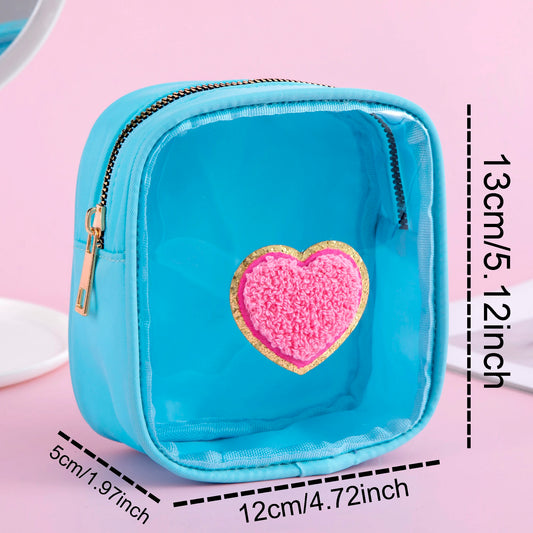 Kawaii Mini Waterproof Lipstick Pouch β¨π Chenille Heart & Rainbow Plane Patches | Clear PVC Travel Makeup Bag πβοΈ Zippered Cosmetic Case