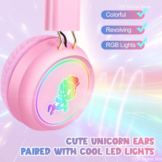 Kawaii Rainbow Unicorn Wireless Headphones 🎧✨ - Cute Stereo Earphones for Kids with RGB Lights & Mic, Perfect Gift! 🦄💖