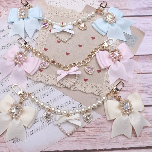 Kawaii Pearl Bow Rhinestone Love Pendant Bag Charm 🎀 | Handmade Japanese Sweet Accessories for Girls 💖✨