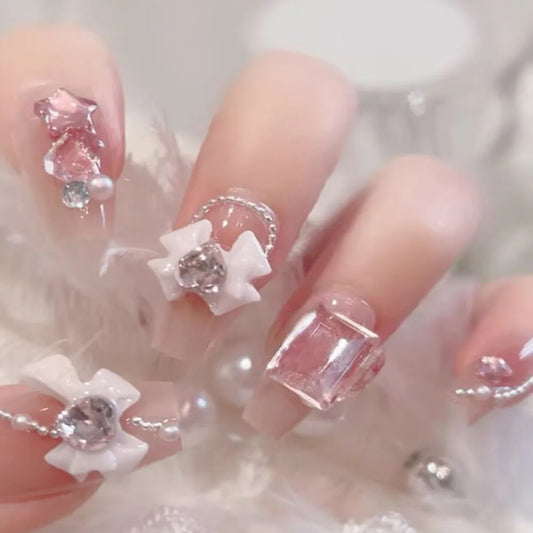 Kawaii Love Bow Rhinestone Press-On Nails πβ¨ | 10Pcs Handmade Coffin Nail Set for Adorable Manicures π π