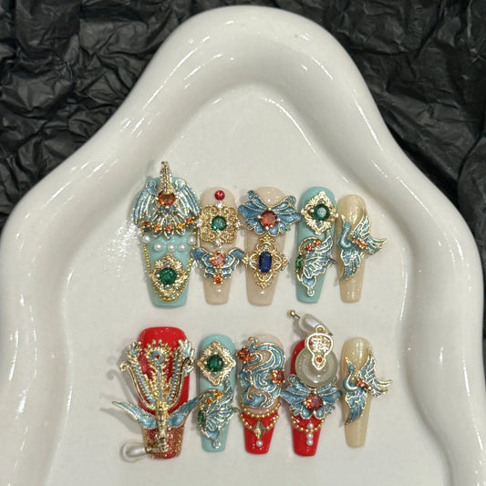 Kawaii Dragon & Phoenix Nail Art Set πβ¨ | 10pcs Colorful Press-On Nails with Diamond & Gold Chain Decor ππ