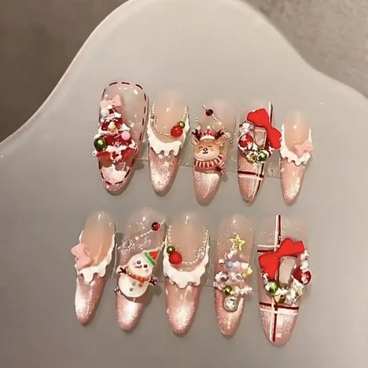 Kawaii Christmas Nail Set ππ | 10pcs Red 3D Bow & Snowman Press-On Nails for Festive Fun! β¨