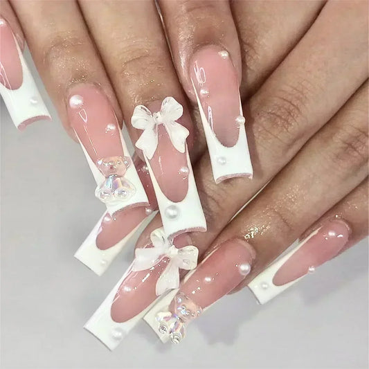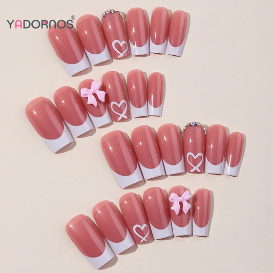 Kawaii Pink Bowknot & Diamond French Tip Press-On Nails πβ¨ | Medium Length Nail Art for Sweet Girls πΈπ
