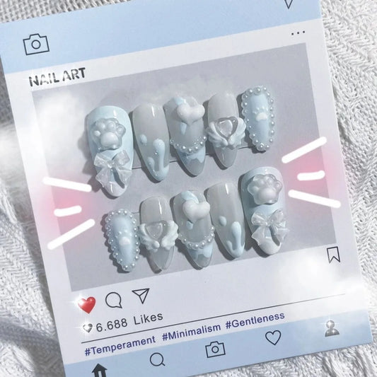 Kawaii 10pcs Light Blue 3D Love Bow Press-On Nails πβ¨ Sweet & Stylish Fake Nails for Adorable Manicures! πΈπ