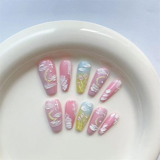 Kawaii 3D Press-On Nails Set πβ¨ - 10Pcs with Love Hearts, Moon, Butterfly & Rhinestones ππ¦ - Perfect for Nail Art Lovers!