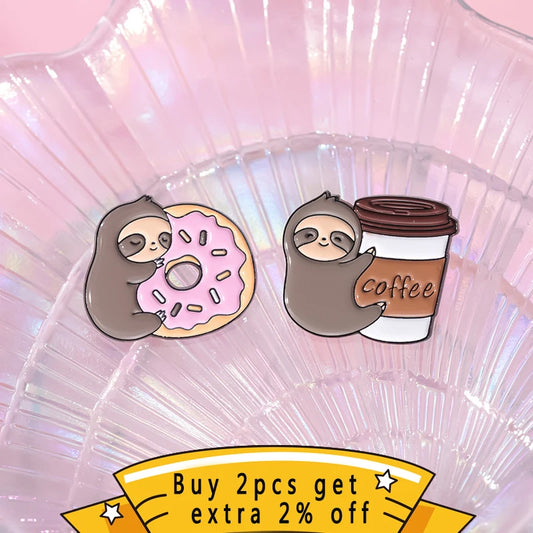 Adorable Sloth Enamel Pin 🦥 | Kawaii Coffee & Donut Brooch 🍩 | Trendy Metal Lapel Badge for Backpack & Clothes 🌟