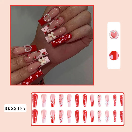 Kawaii Strawberry Heart Press-On Nails ππ - 24 Pcs Cute Pink Dot & Pearl Design for Nail Art