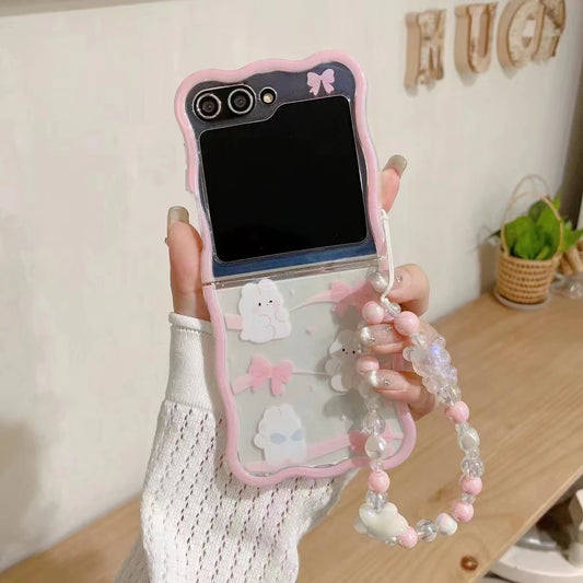 ✨ Adorable Bear Pearl Bracelet Case for Samsung Galaxy Z Flip 5, 4, 3 - Cute Cartoon Clear Cover! 🐻💖