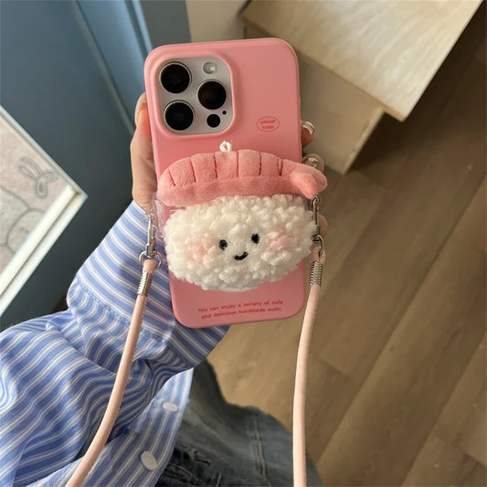 Adorable Kawaii Sushi Plush Crossbody Phone Case 🍣✨ for iPhone 12/13/14/16 Pro Max - Cute Cartoon Design with Lanyard! 🌈📱