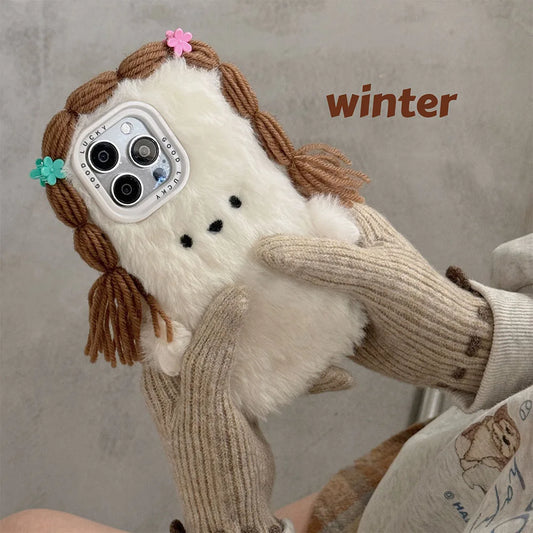 Kawaii Fluffy Cartoon Hair Girls iPhone Phone Case 🌈✨ Cute Plush Cover for iPhone 15/14/13/12/11 Pro Max!