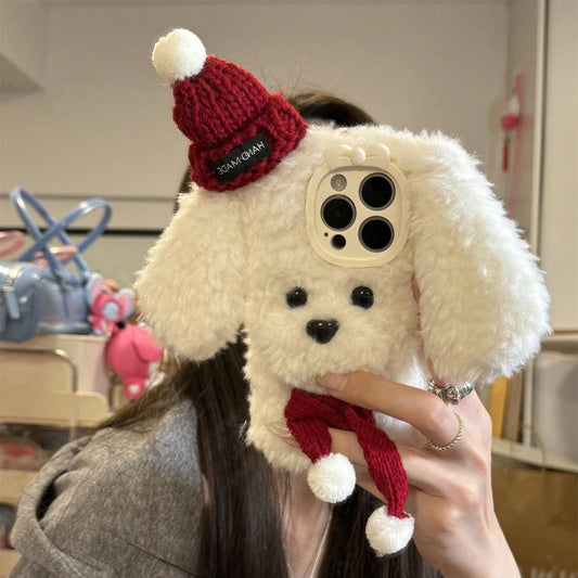 Kawaii Plush Puppy Hat & Scarf Phone Case for iPhone 16 Pro Max 🐶✨ Cute & Cozy Cell Phone Accessory!