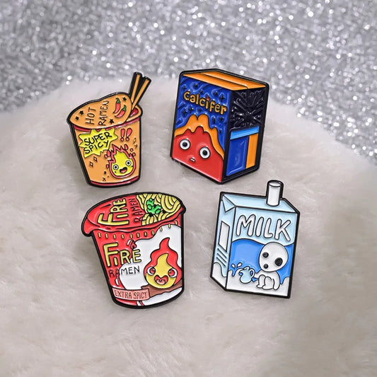 Kawaii Fire Demon Ramen Enamel Pins 🍜✨ Custom Cartoon Brooches for Kids 🎒 Adorable Anime Jewelry Gift