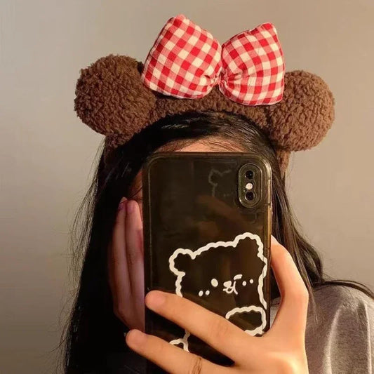 Kawaii Bear Ear Headband 🐻✨ | Cute Bowknot Hairband for Winter | Plush Cartoon Face Wash Hair Hoop for Girls 🎀