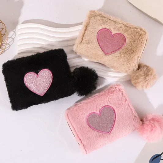 Women's Cute Plush Heart Print Wallet Zipper Coin Purse ID Credit Card Holder Clutch Bag Mini Purse Coin Pouch Card Wallet