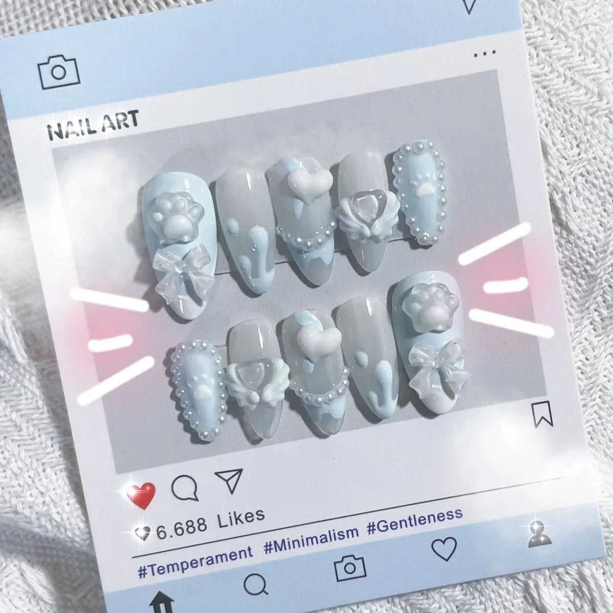 10pcs Handmade Light Blue Fake Nails are a delightful way to add a sprinkle of sweetness to your look! Featuring an adorable 3D white love bow design, these false nails are perfect for every kawaii-loving girl.