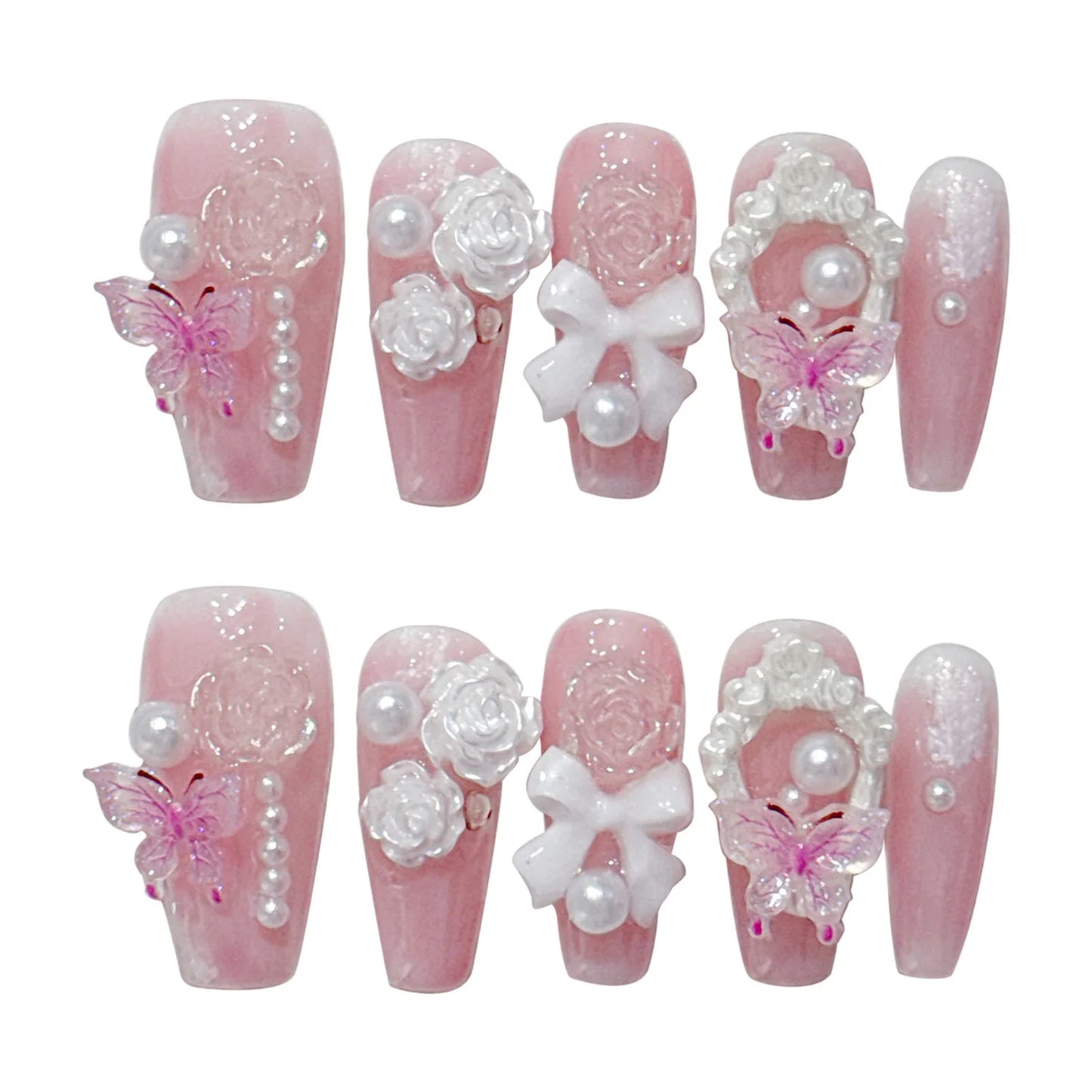 Kawaii Dream 🌸 10pcs 3D Butterfly & Rose Decor Press-On Nails 💅🏼 Long Ballet Style for Sweet Y2K Weddings & More!
