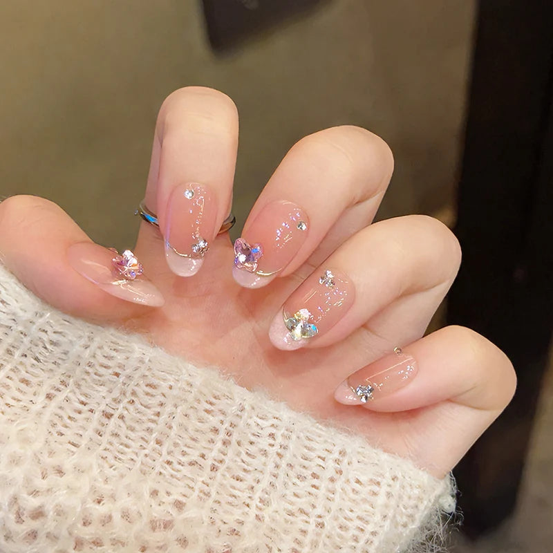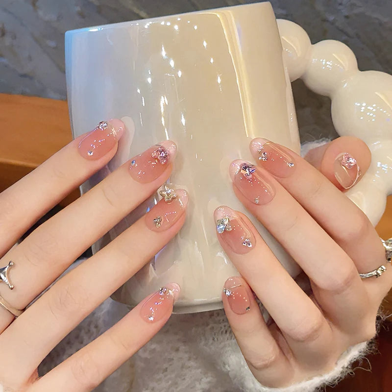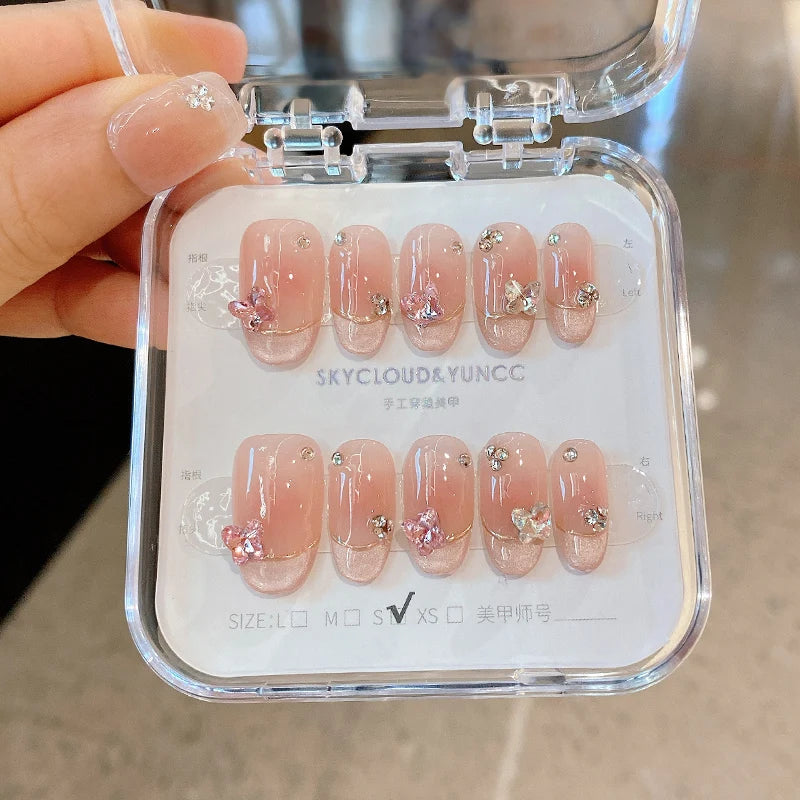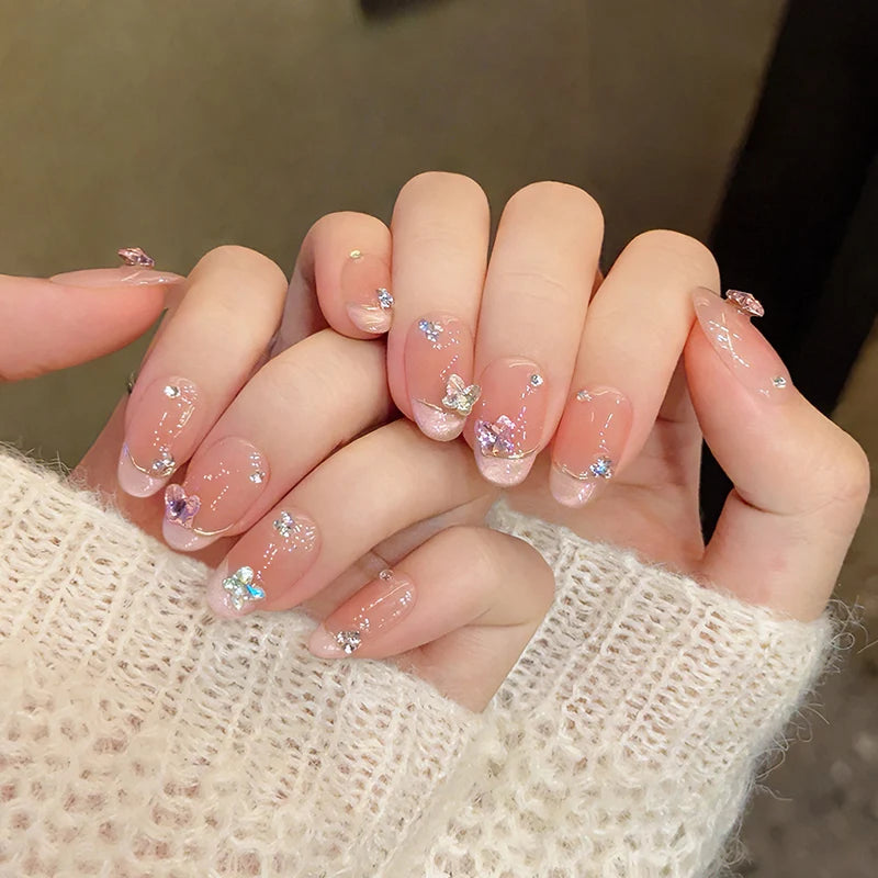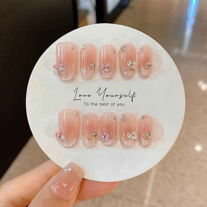 Kawaii Pink Butterfly Press-On Nails πΈβ¨ | 10Pcs Almond-Shaped Nail Art with Rhinestones π¦π