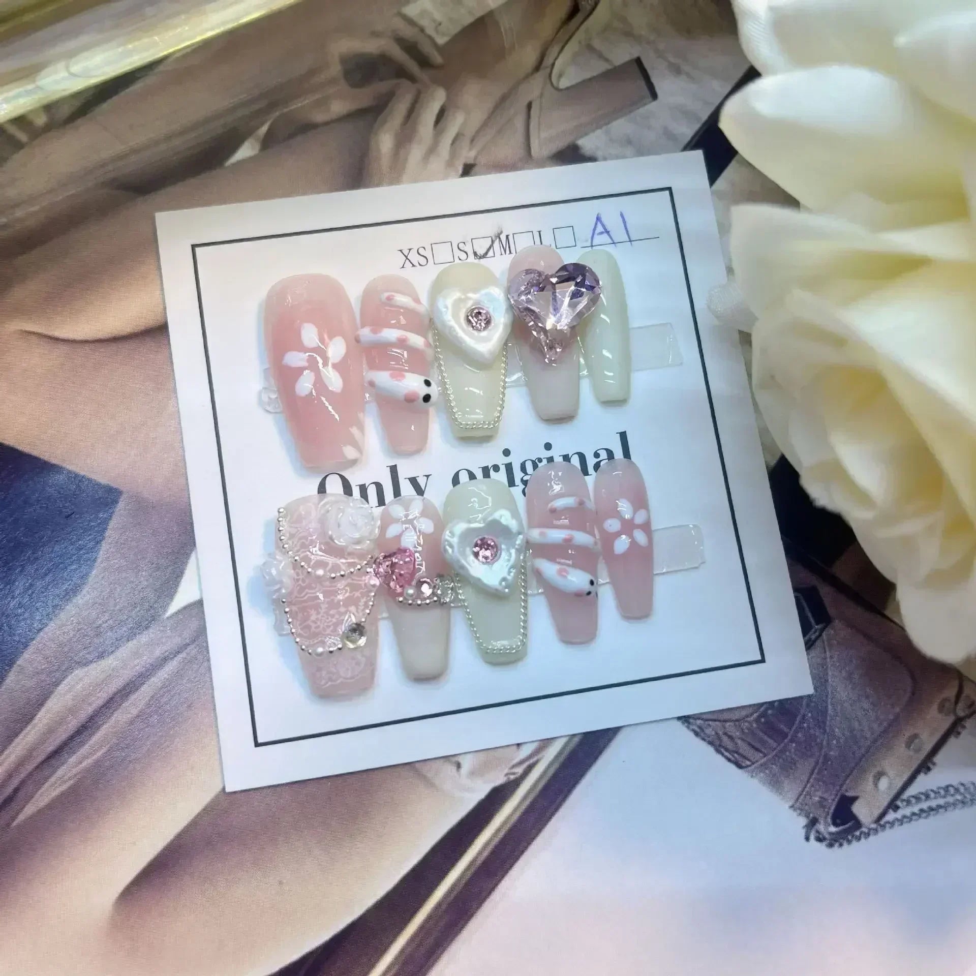 Adorn your fingertips with our 10Pcs Handmade Press On Nails! These enchanting pink fake nails are adorned with 3D love hearts, moons, and delightful butterflies, each sparkling with rhinestone designs to steal the show!