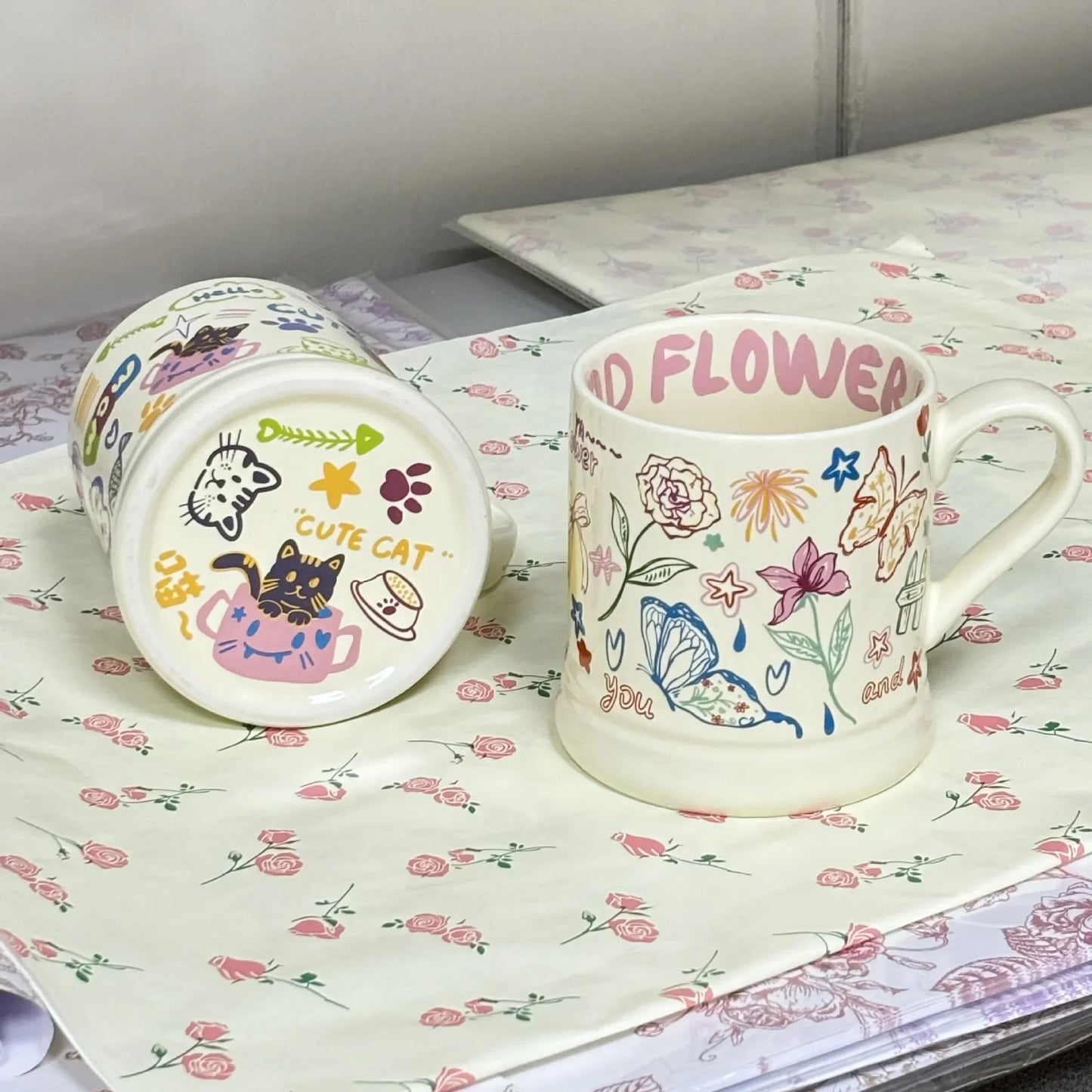1pc Creative Cute Ceramic Cup Flower Printed Cat Pattern Household Breakfast Milk Juice Afternoon Tea Coffee Mugs Gift Drinkware