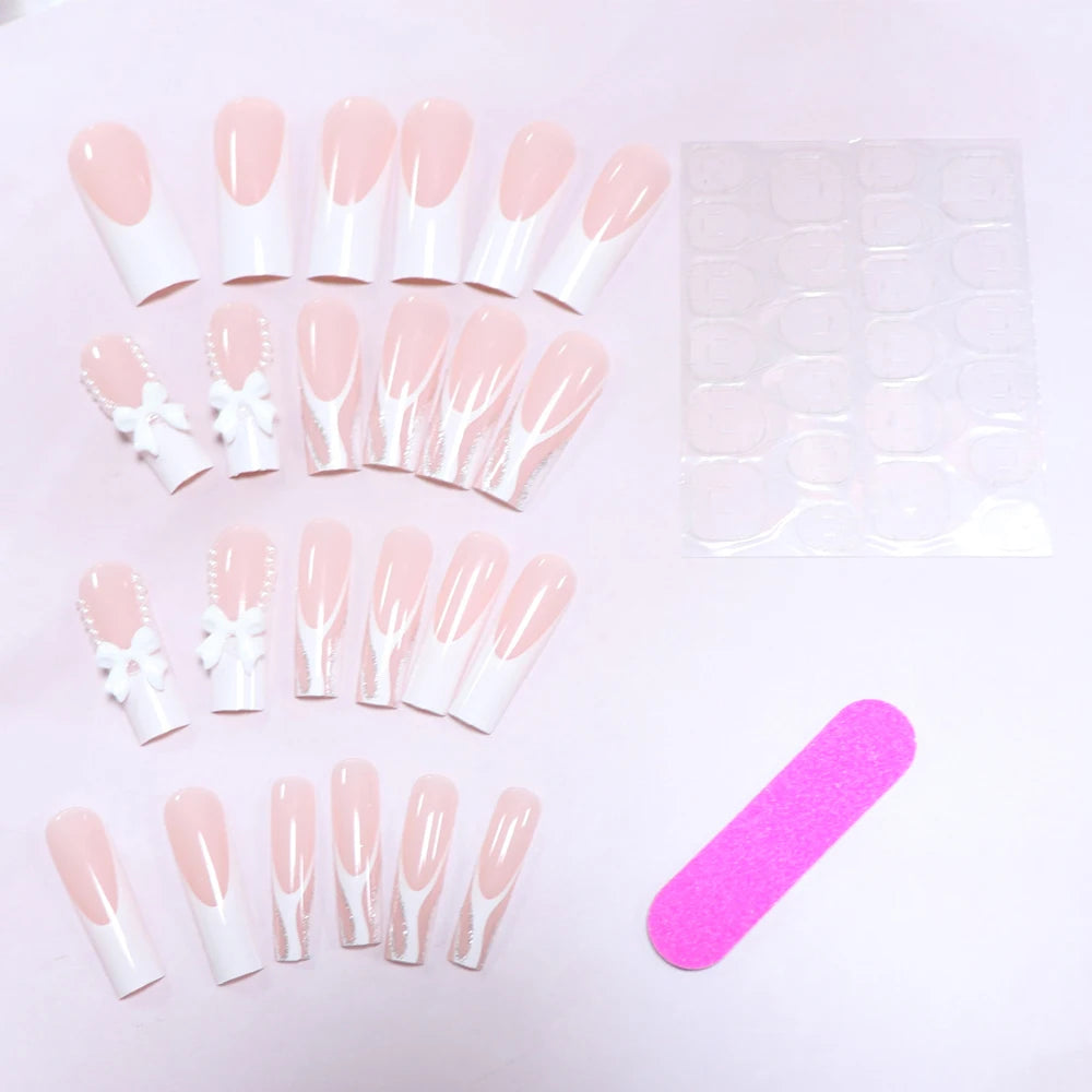 Kawaii 24pcs Bowknot Coffin Press-On Nails πβ¨ Sweet French Tips with White Pearls for Summer Parties πΈπ