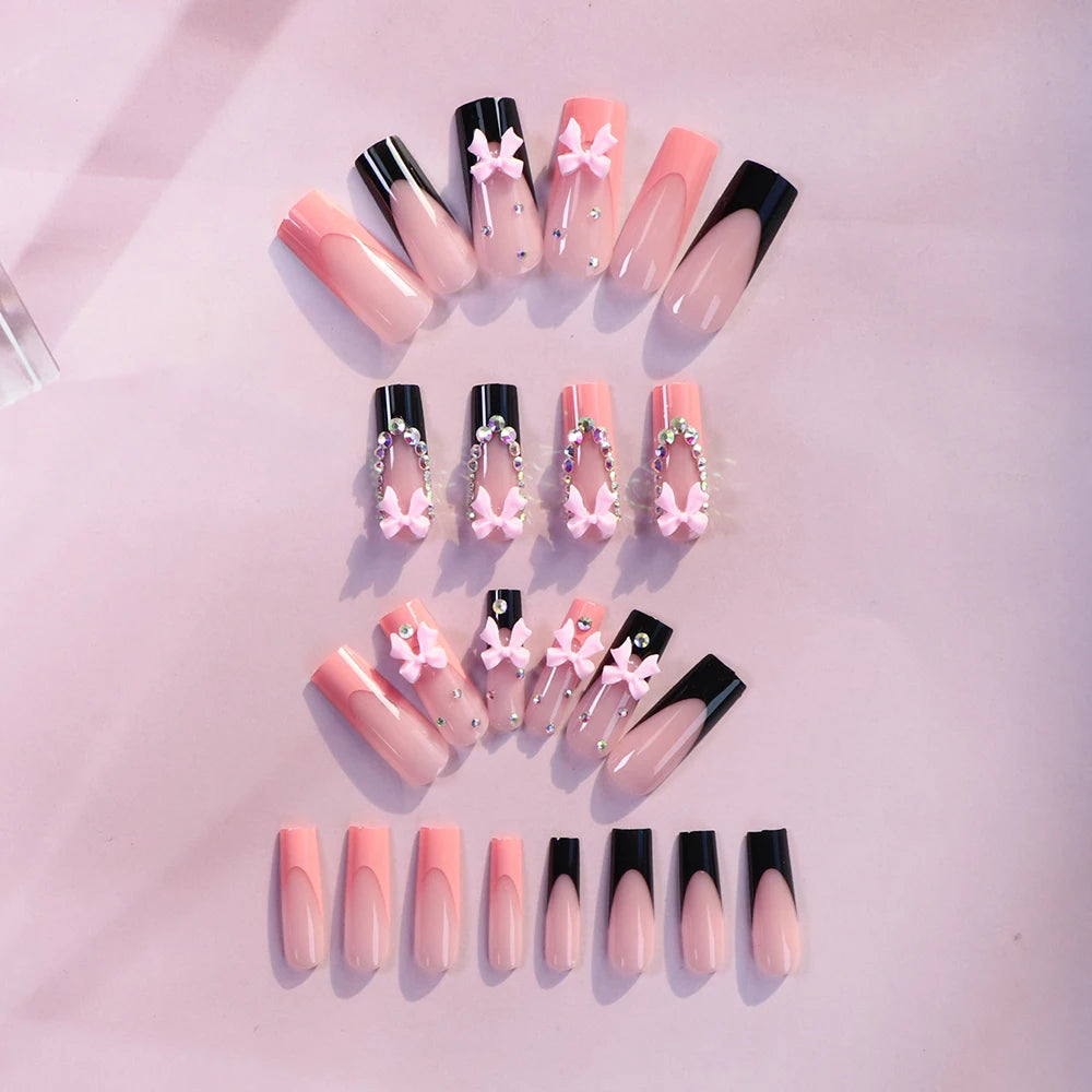 Transform your fingertips into a kawaii wonderland with our 24pcs coffin long press on nails bowknot black fake press on nails white pearl summer nails sweet french tip press on nails cute! Each set features 24 charming nails that are designed to dazzle and delight.