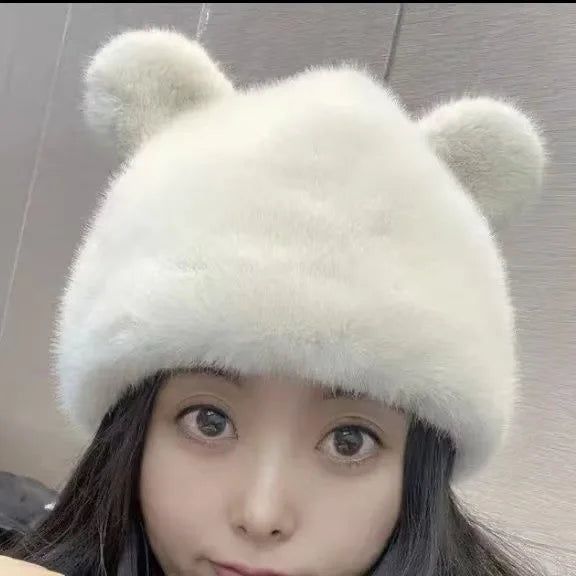 Cute Kawaii Black Bear Ears Plush Rabbit Fur Hat π»βοΈ | Cozy Knitted Cap for Winter Fun!
