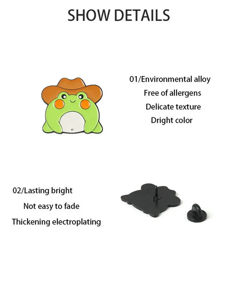 Hop into style with our Kawaii Cowboy Hat Frog Enamel Pins! These adorable froggy brooches are perfect for adding a splash of cuteness to your bags and clothes. Made from high-quality zinc alloy, they are both trendy and durable, ensuring your new favorite accessory lasts through all your adventures!