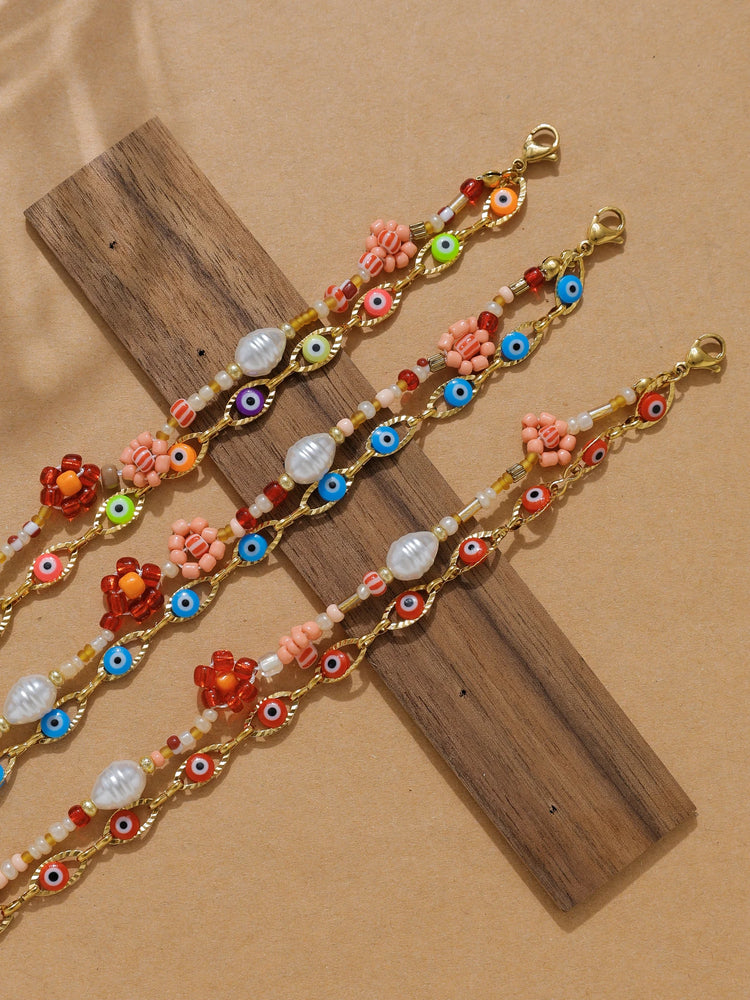 Designed for women, this fashion-forward bracelet features a double-layer link chain with freshwater pearls, enamel rice beads, and a lucky Turkish evil eye charm. Crafted in durable stainless steel, it resists tarnish while remaining lightweight and comfortable. The lobster-claw clasp ensures easy wear, making it perfect for everyday looks or boho-inspired outfits.