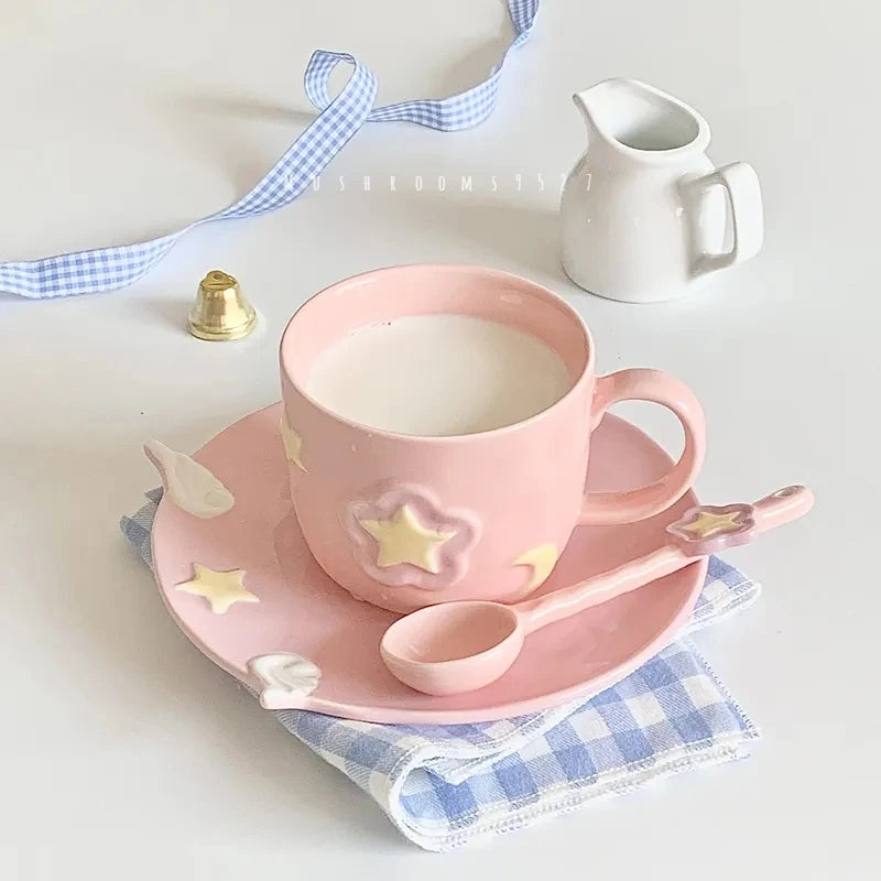 Pink Winged Tea Set βπΈ - 3D Star Mug & Saucer with Spoon β¨