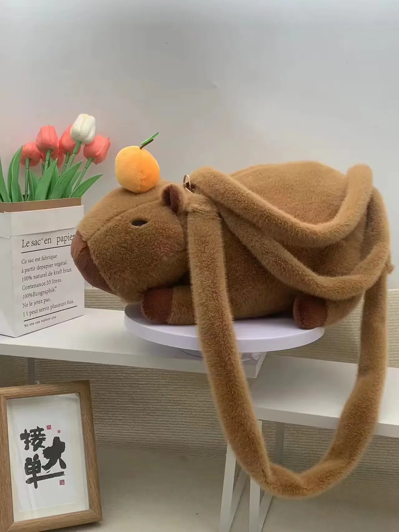 Meet the Adorable Capybara Plush Backpack! This charming dual-purpose shoulder bag doubles as a cuddly plush toy, perfect for carrying your essentials while showcasing your love for kawaii culture. Measuring 30 cm, its soft short plush exterior is filled with fluffy PP cotton, making it irresistibly huggable!