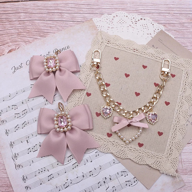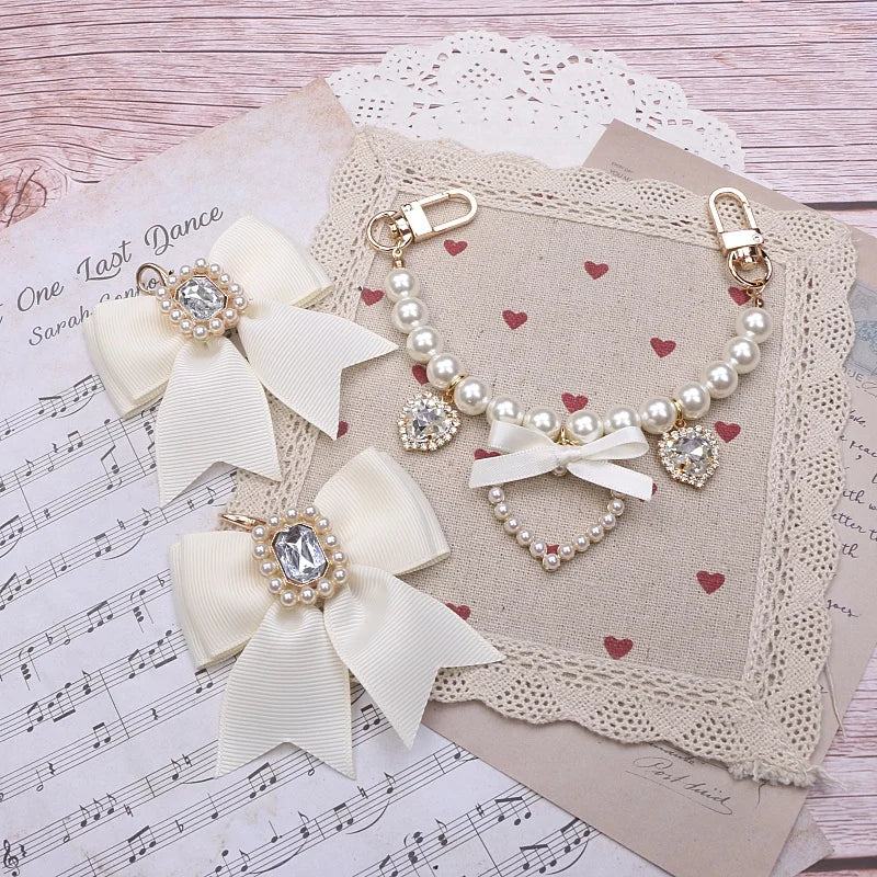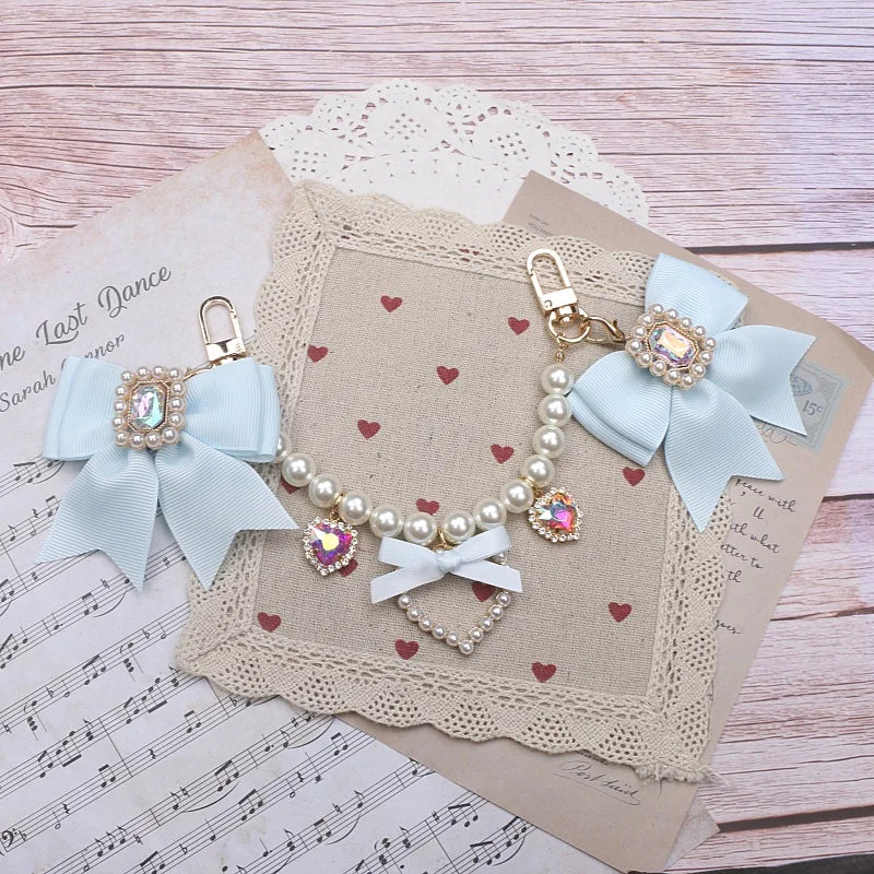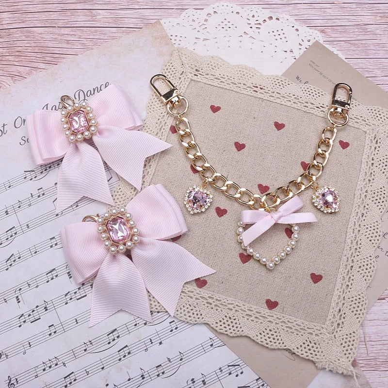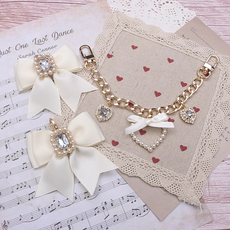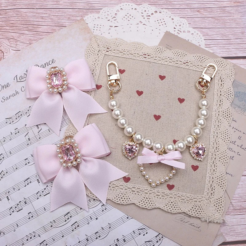 Kawaii Pearl Bow Rhinestone Love Pendant Bag Charm 🎀 | Handmade Japanese Sweet Accessories for Girls 💖✨