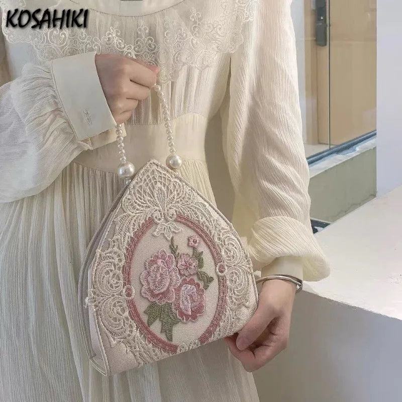 Kawaii Floral Lace Handbag πΈβ¨ Cute Y2K Top-Handle Bag with Pearl Chain for Fairy Girls π Fashionable Soft Bucket Purse for Women